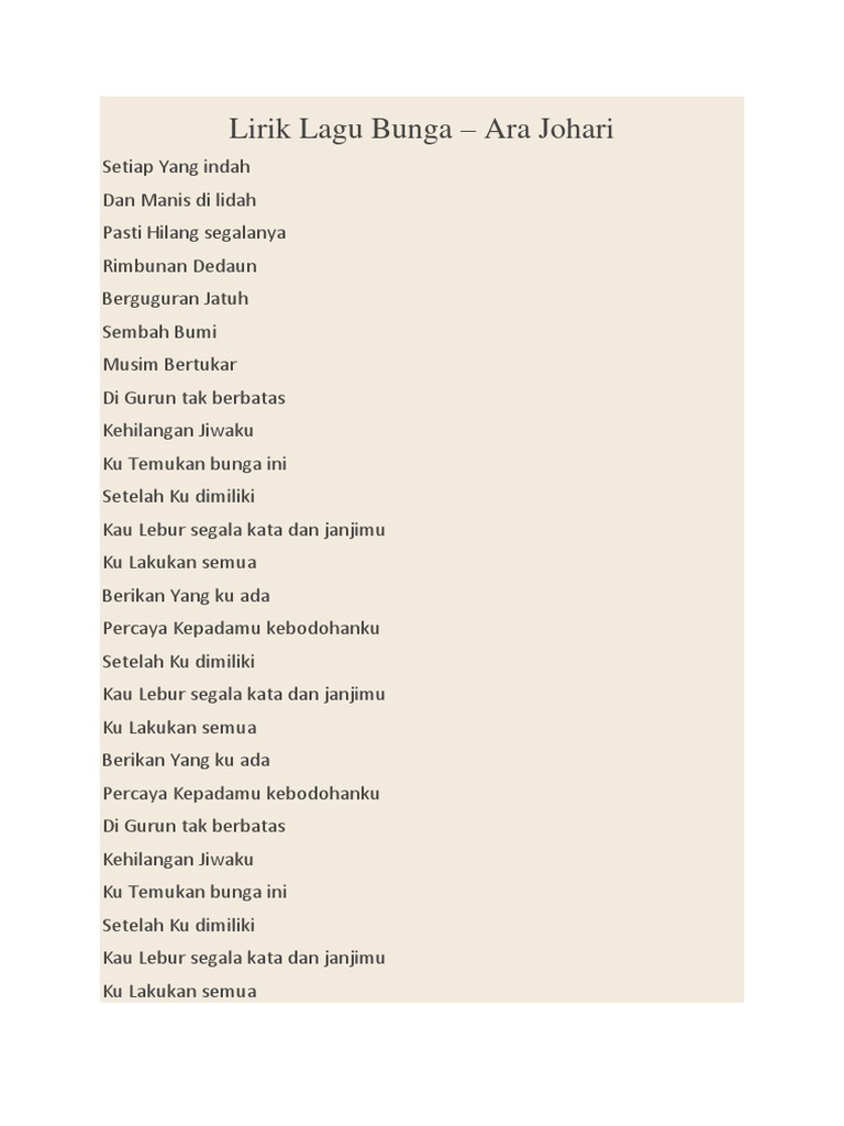 Ara Johari Lyrics Setiap yang indah Dan manis di lidah Pasti hilang segalanya Rimbunan dedaun Berguguran jatuh Sembah bumi Musim bertukar Di gurun tak berbatas Kehilangan jiwaku Ku temukan bunga ini Setelah ku dimil. Februari 16 2018 Lirik Lagu Ara Johari - Bunga. Dm digurun tak berbatas F kehilangan jiwaku C kutemukan.